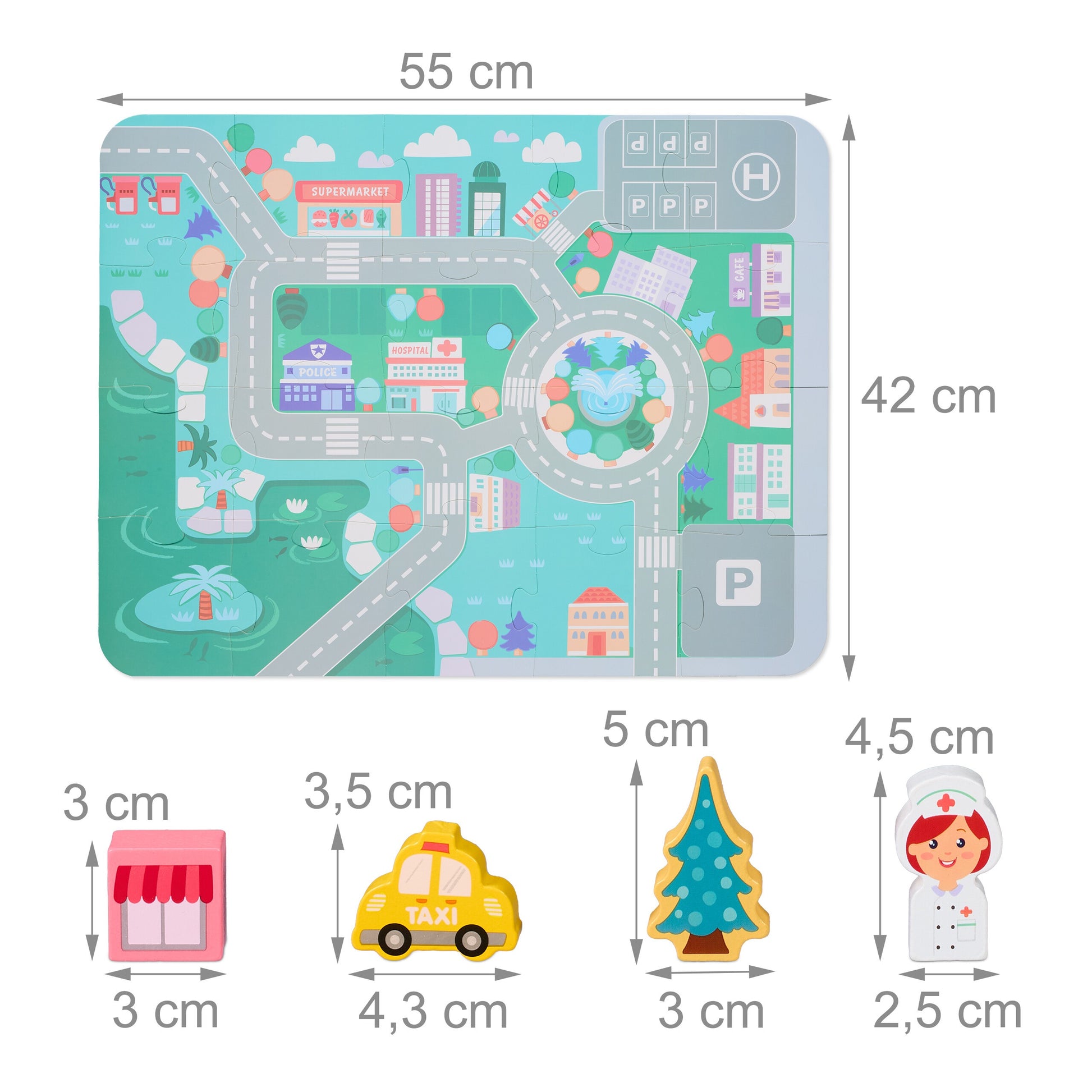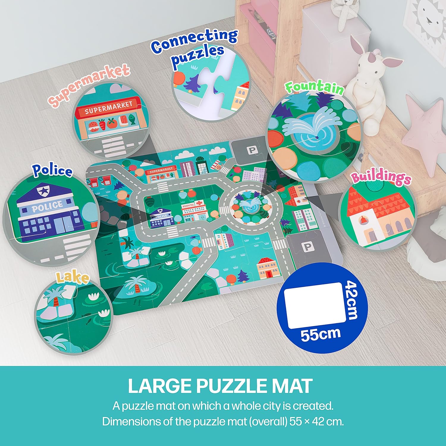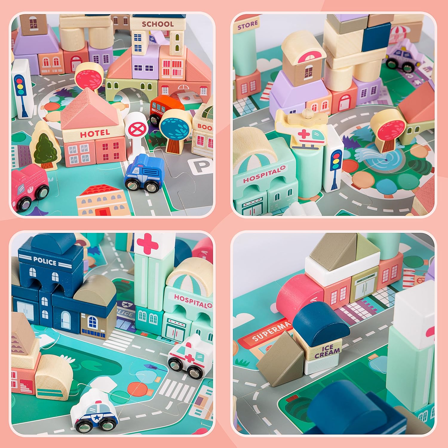 - 115 PIECES WOODEN BUILDING BLOCKS: The city building blocks familiarizes the child with the hustle and bustle of city life. The child can stack various buildings such as school, library, fire station, police station, supermarket, hospital, museum, bank. The blocks offer you unlimited Building Possibilities – Mix and match the various sizes and shapes to build and re-build city of every design! This building blocks set also contains 26 letters (A to Z) and 0-9 numbers.