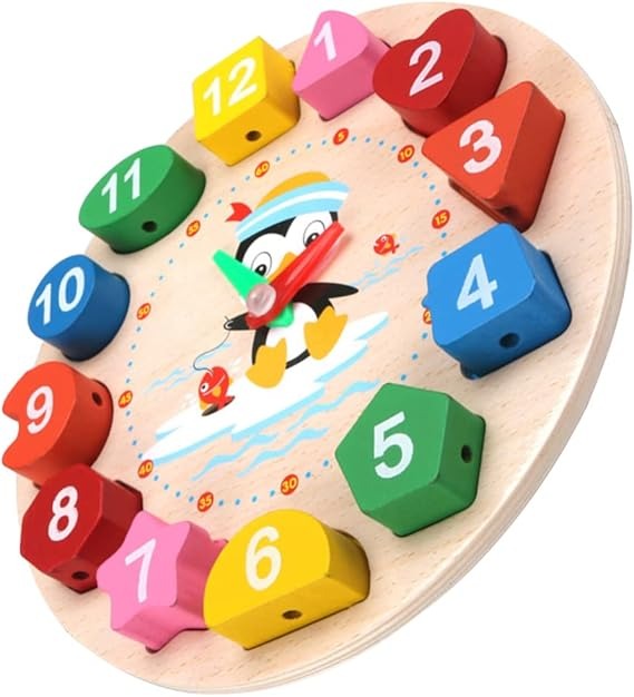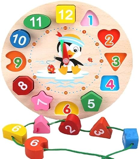 The hour and minute hands are printed very clearly, and the hour blocks (1-12) are identified by different colors and numbers shape recognition ability, and improves fine motor skills and hand-eye coordination, develop abilities, thereby fostering toddler interest in learning. It’s calls three alarm clock because there were 1 Geometric Clock, 12 Removable Shapes, 1 Lacing Thread included in the Package