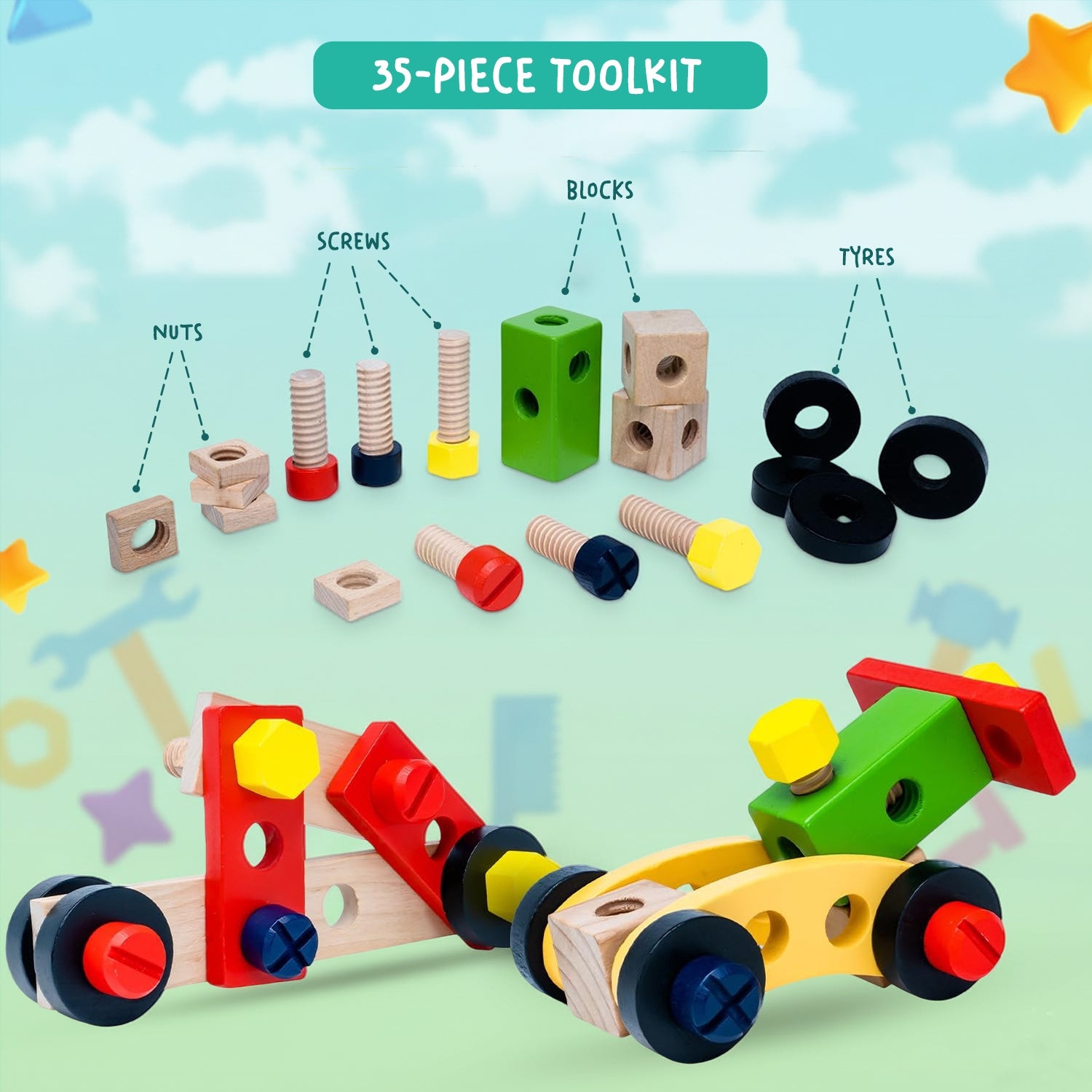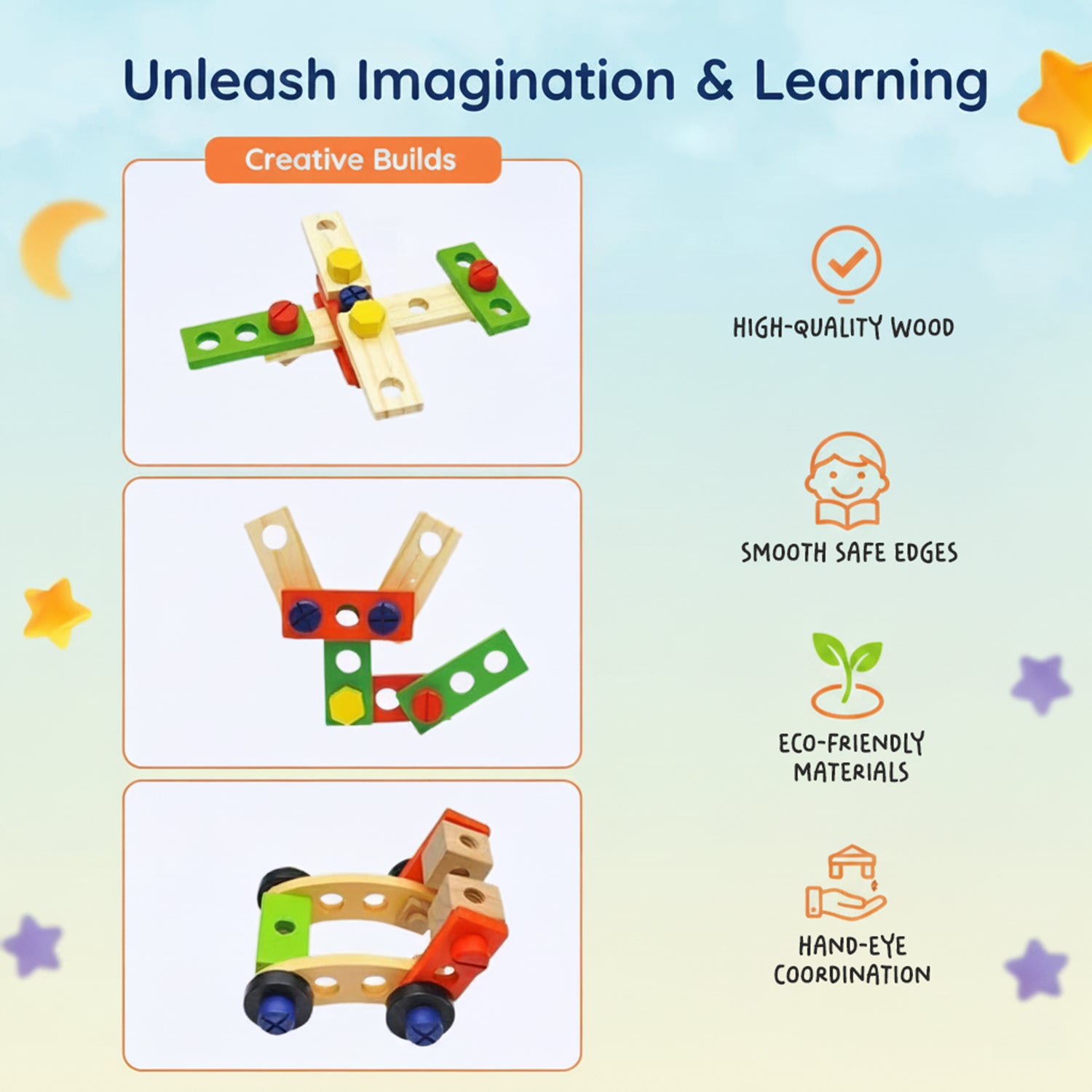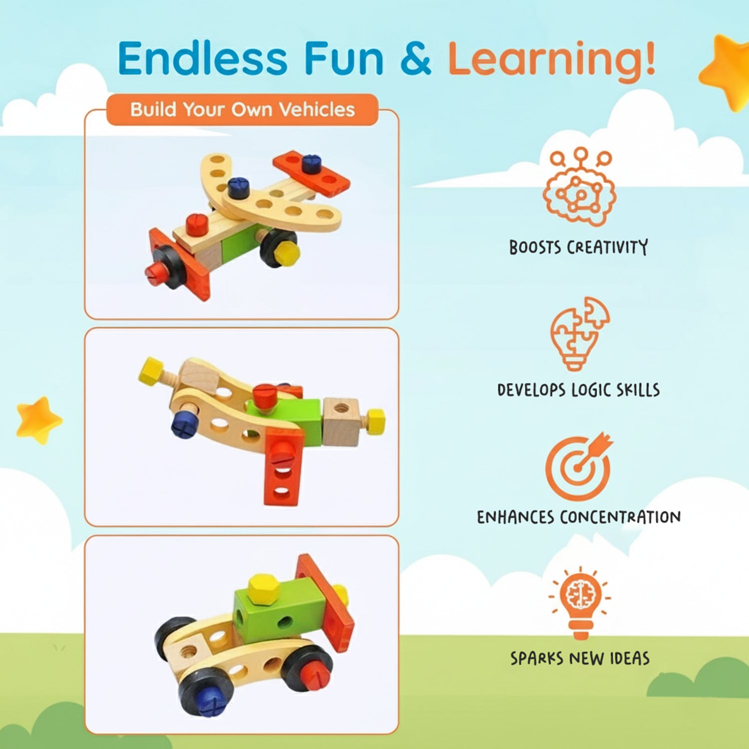 3.. fosters creative play and enhances problem-solving abilities as kids join different parts together with the help of a hammer and screwdriver and design vehicles, windmills, any shape