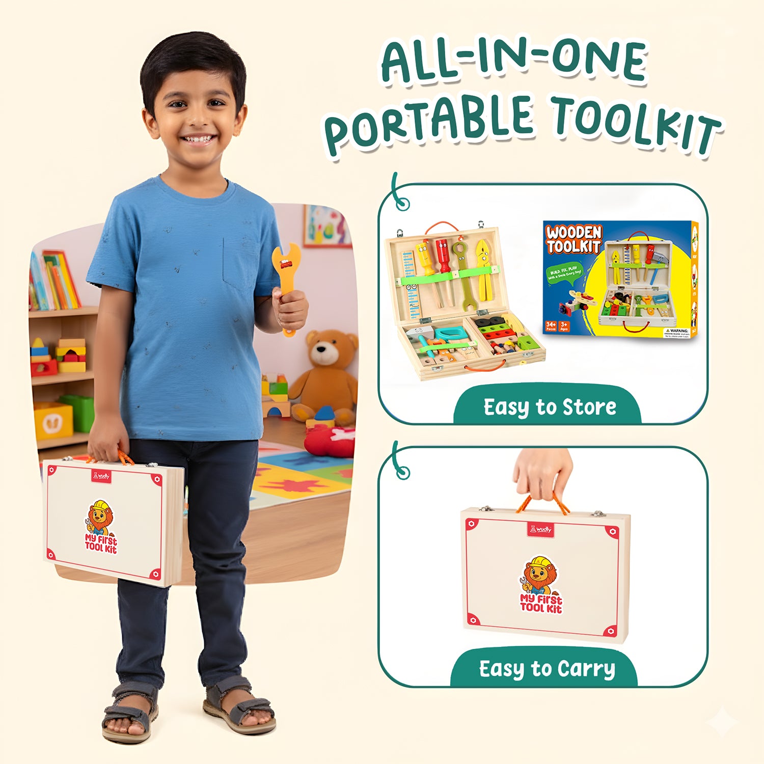 2.Designed For Little Hand The accessories of this children's tool are made of high-quality wood and can withstand hours of use and play. It has no sharp edges or pointed parts and is therefore safe for children to play
